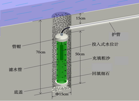 测库水位硅压式水位计的安装,先在滤水防护管中装入滤洗过的中细沙,直到超过管外的透水石,将水位计从顶部放入滤水防护管中,再装入滤洗过的中细沙,直到满管,盖上管帽拧紧,水位计电缆从管帽电缆出口引出,用吊重钢丝绳固定,做好电缆保护防止雨水浸入通气管。
