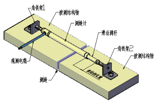 振弦式表面测缝计由测杆、护管、后端座,观测电缆、测温元件、振弦及激振电磁线圈等。