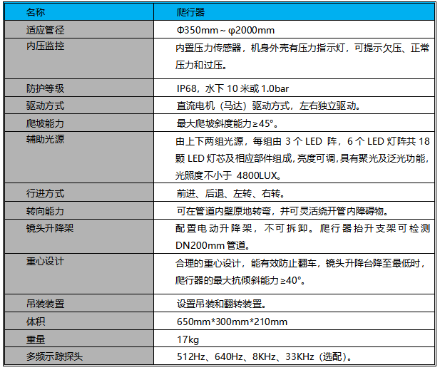 管道检测机器人主要是由摄像头、爬行器本体、线缆卷盘、智能控制终端显示器和计算机软件控制系统等组成,采用工业级高分辨率彩色摄像单元,连续、实时记录管道内部的实际情况,根据摄像系统拍摄的录像资料,对管道内部存在的问题进行缺陷性质的判断分析,为下一步的养护、疏通、修复提供可靠的技术依据。