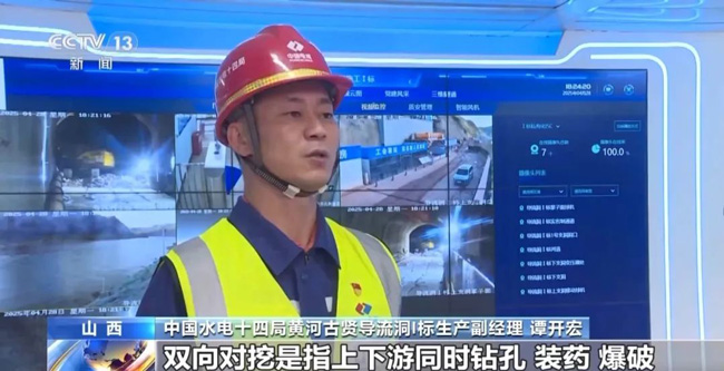 中国水电十四局黄河古贤导流洞I标生产副经理 谭开宏:双向对挖是指工程上下游同时钻孔、装药、爆破,极大地提高了施工效率。动态支护是指采用自进式预应力锚杆进行支护,有效加固围岩,安全性大幅提升。