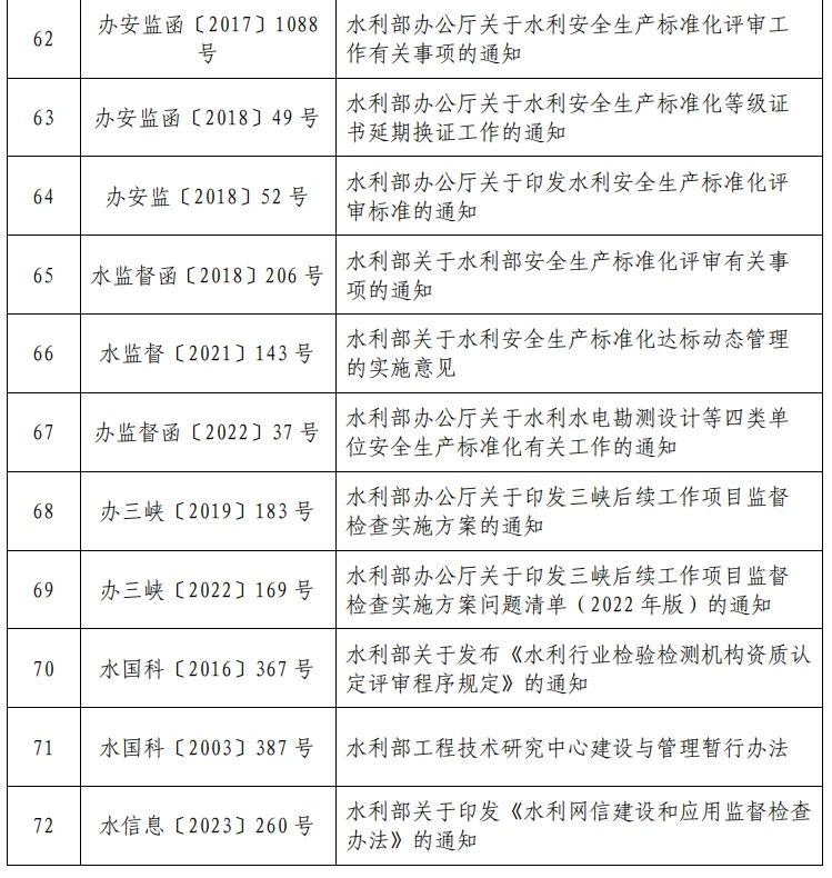 根据党中央、国务院有关要求和工作实际,水利部决定废止已不适用的72个文件(详见附件)。废止文件自本公告印发之日起停止执行,不再作为行政管理的依据。