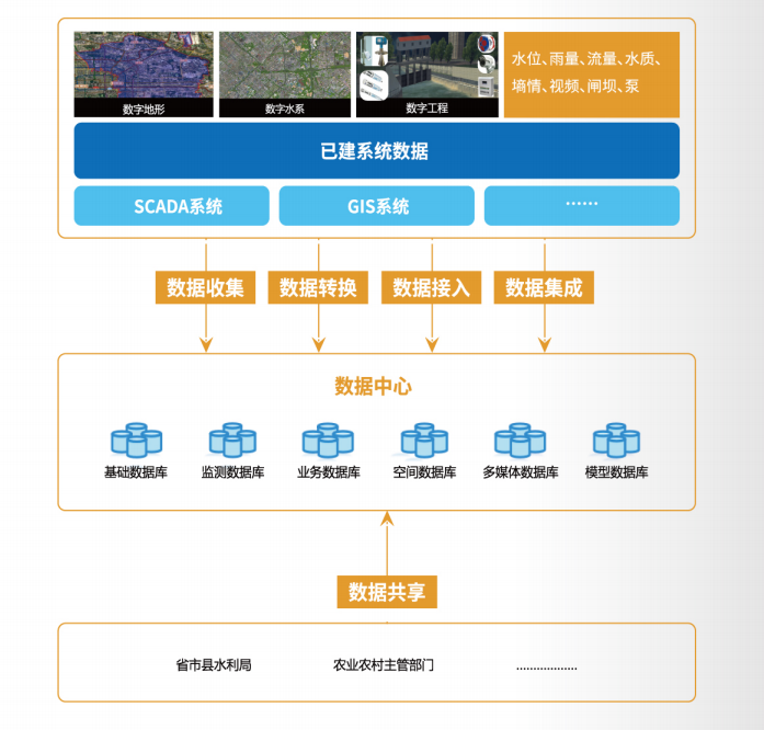 灌区信息化管理系统以数据共享、业务协同为根本出发点,通过数据收集整编、数据接入、汇集(数据标准化处理、标准化接口定制),整合重构各类水利信息资源,建立互联互通智能融合的大数据中心,实现数据集中采集、集中存储、集中管理、集中使用。