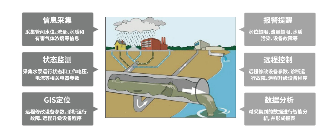 排水管网监测系统是基于物联网理念,采用信息化手段,结合GIS 展示,全面掌握排水系统的运行情况如管网水位、 流量、水质、有害气体浓度、泵站运行状态等,保证排水系统安全高效运行;通过构建安全预警平台,提高应急指挥及快速 处置能力;提供科学、先进的城市级水力分析模型,全面评估城市排水管网能力。